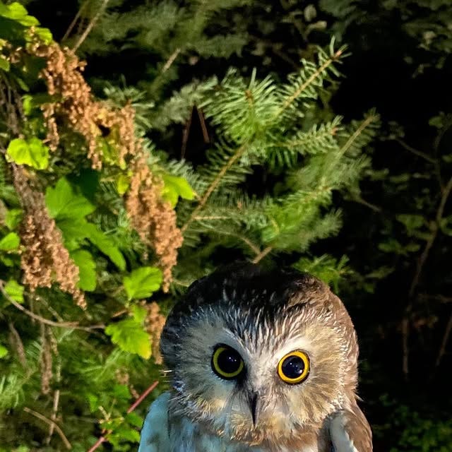 The owl saw her and instantly exploded from the table with a speed I didn’t think possible. Its small wings moved rapidly, and it darted up and out of the big outdoor tent it had hidden in, up and up into the tall, dying pine tree in my mother’s yard, instantly out of sight. I was so glad - it was healthy enough to do so, and that meant that no rescue, no kennel, no towels, no trip to the wildlife center was needed. My sister played a saw-whet owl call to see if it would answer back, but it stayed silent, an instant ghost. If it weren’t for the indentation in the snow where it had landed, this owl could have been a figment of all our imaginations.2